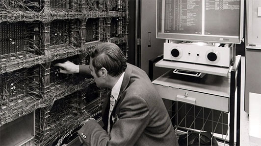 For scale, here is an image of a technician working on a 370 backplane (from a more high-end 370/165 CPU). In the larger version of the image, you can see a hinge in the upper center of the image. The technician and the rolling microfiche cart are actually inside the computer: